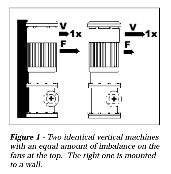 Lets think about it. In the machine not attached to the wall, the forces of imbalance are causing it to vibrate – generating motion. The machine that is attached to the wall is now less free to vibrate; in other words, it is less flexible or stiffer. So where are those forces of imbalance going? The force from the imbalance must be borne by the bearings on its way to the wall. Because there are more forces on the bearings in the attached machine, this one will fail first. Our instinct to repair the machine with higher vibration levels would have been misguided!